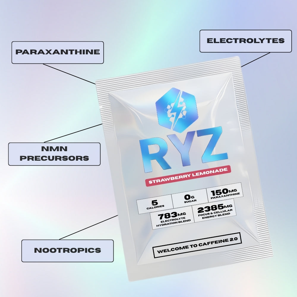 We've engineered RYZ SuperCharged Electrolytes to be the cleanest, most effective energy solution on the market. Our formula centers on paraxanthine—the active metabolite your body converts caffeine into—delivering pure energy without the jitters, anxiety, or crashes of traditional caffeine. We've combined this with a precision-dosed electrolyte matrix (783mg of sodium, potassium, and magnesium) to ensure optimal hydration and sustained performance. NMN precursors support cellular energy production and longevity at the source, while our nootropic blend (238mg) sharpens focus and mental clarity. At just 5 calories and zero sugar, this formula is designed to maximize energy, hydration, and cognitive function—without compromise.